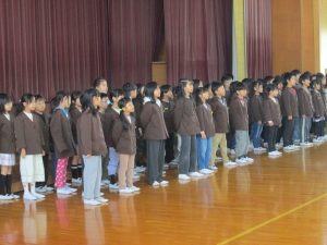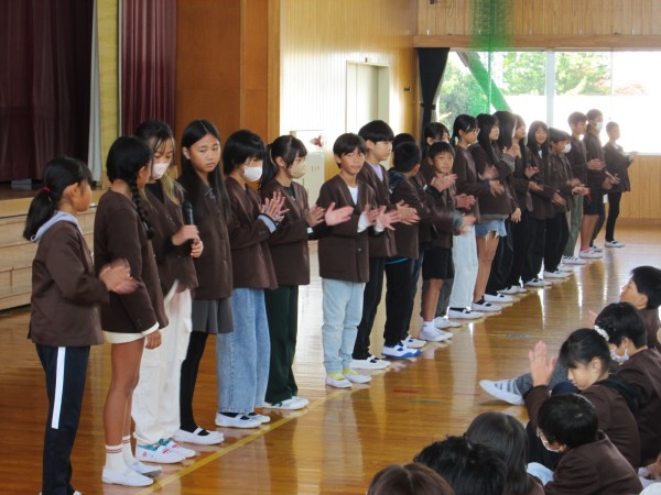 本日の全校朝会では、明日(5日)に開かれる市陸上記録会の壮行会と2,5年生の詩の音読発表会がありました。壮行会では、選手一人一人が抱負を述べ、明日の記録会での頑張りを誓ってくれました。音読発表会では、2年生が「ひとつのことば」、5年生が「平家物語」をしっかり発表してくれました。また、生徒指導や校長からは、「あいさつ」についてと「言葉」の大切さにつて話をしました。